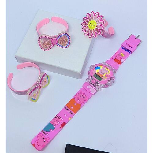 Kit Relógio Infantil Digital Pisca Luz Toca Musica Princesas Disney Minnie Barbie + Pulseira Bracelete 3D Colorida - Cor: Peppa