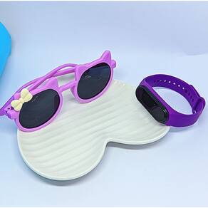 Kit Relógio Infantil Silicone Ajustável Prova água + Óculos de Sol Menina Gatinho Formato Gato com Laço Tendência - Cor: Roxo