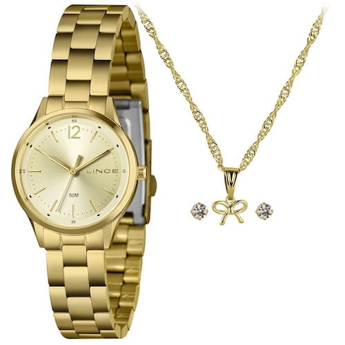 Características : Formato do Relógio: Redondo Caixa do Relógio: Aço Cor Predominante do Relógio: Dourado Cor da Pulseira: Dourado Cor do Mostrador: Champanhe Tipo de Vidro: Cristal Mineral Medidas dos Relógios: 30 MM Garantia 12 meses em qualquer Assistência Técnica Lince