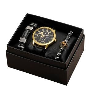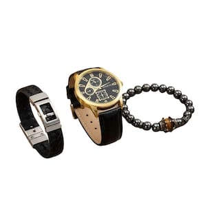 Kit masculino elegante composto por relógio analógico dourado com pulseira preta e duas pulseiras de estilo moderno. O relógio possui mostrador preto com marcadores dourados, trazendo um visual luxuoso e imponente. As pulseiras combinam detalhes metálicos e contas, complementando o look com sofisticação. Ideal para presentear ou elevar qualquer produção casual ou social.