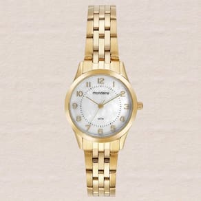 O kit Mondaine 32796LPMKDE1K2 traduz sofisticação e feminilidade em cada detalhe. O relógio dourado apresenta mostrador em madrepérola com numeração completa e acabamento metálico refinado, proporcionando brilho sutil e elegância atemporal. A pulseira em aço inoxidável dourado garante conforto, resistência e harmonia visual. Acompanha uma pulseira com pedras coloridas lapidadas em tons de verde, azul, lilás e rosa, que adiciona um toque moderno e vibrante ao conjunto. Ideal para mulheres que valorizam estilo e versatilidade, o kit é perfeito tanto para o dia a dia quanto para ocasiões especiais. Com resistência à água de até 5 ATM, une beleza, praticidade e durabilidade — uma expressão refinada do design Mondaine.