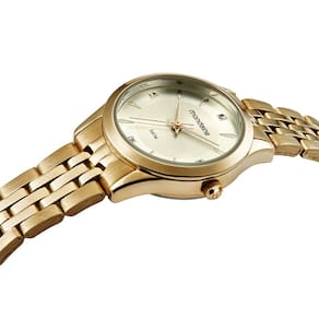 Super delicado, este kit é um presente incrível. Ele contém um relógio analógico dourado, com caixa em metal e pulseira em aço com fecho botão de fácil ajuste. Para complementar o look, ele também traz um lindo colar com cristal que combina com os brincos cristais. Esse relógio possui a caixa em 2,8 cm de tamanho.