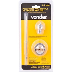 Marca: VonderConteúdo da embalagem:1 Agulha de 1,7 mm, 1 bico de 1,7 mm, 1 capa de ar, 1 porca da capa de ar, 1 anel de vedação da capa de ar e 1 anel de vedação da porca.Destaques e diferenciais:Possui agulha e bico em inox, capa de ar em latão, proporcionando maior resistência à oxidação/corrosão.Aplicações e dicas de uso:Indicado para uso exclusivo na Ferramenta de aplicação de pintura modelo PSV 200 VONDER.Detalhes TécnicosMaterial do bico: Aço inox Diâmetro do bico da Ferramenta de aplicação: 1,7 mm Modelo da Ferramenta de aplicação: PSV 200 Massa aproximada peso kg : 0,1 kg - E CDC : legal: 90 dias Marca: Não Informado