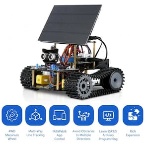 O ACEBOTT ESP32 Smart Tank Solar Robot Car é um kit educativo de robótica que utiliza controlador ESP32 programável e chassi 4WD com rodas mecanum omnidirecionais, permitindo movimentos em 360° como avanço, recuo, deslocamento lateral, diagonal, rotação e deriva. O projeto é compatível com Arduino IDE e inclui 16 tutoriais em formato de histórias que introduzem, de forma progressiva, conceitos de programação, controle de motores, leitura de sensores e princípios básicos de hardware eletrônico em um carro robô. O kit suporta expansão com módulos opcionais, como câmera, braço robótico, conjunto tipo tanque e módulo solar, permitindo evoluir o mesmo robô para diferentes configurações de aprendizado.
