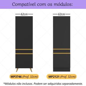 Produzido em madeira de reflorestamento (MDP 12mm), recebe acabamento acetinado com cerca de 20% de brilho, que garante um visual elegante e fácil de combinar com diferentes estilos de cozinha. O kit acompanha pés em polipropileno com sistema de encaixe, que oferecem maior firmeza e estabilidade ao módulo.