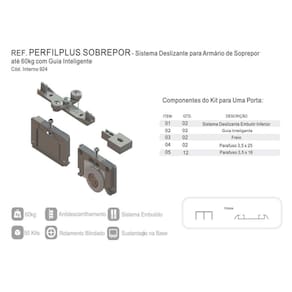 Kit Roldanas Porta Correr Guarda Roupa 924 Perfiplus - Perfil Descrição:Com capacidade de carga de 60 Kg o Sistema Deslizante para Portas de Correr é ideal para portas de armários de grande porte. Sistema rolamentado com mola anti-descarrilamento para portas de madeira (MDF/MDP) e alumínio. Características:- Sistema Sobreposto.- Sustentação na Base.- Sistema com Rolamento.- Para Portas de Até 60 Kg.- Para Portas de Madeira ou Alumínio.- Para Portas com Espessura de 15 e 25 mm.- Kit para 01 Porta.- Parafusos indicados 3,5 x 14 CC / Parafuso 3,5 x 22 CC. Especificações:- Material: Zamac, Nylon- Rolamento: Blindado- Marca: Perfil- Modelo: 924
