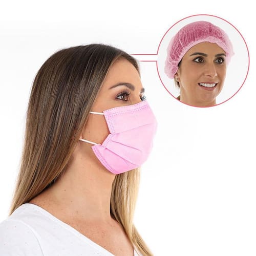 Kit rosa máscara e touca clínica enfermagem dentista médico Máscara descartável tripla camada elastic synergex protclear & touca sanfonada descartável com elástico rosa - protclear