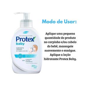 Como utilizar Aplique uma pequena quantidade do produto no corpinho e/ou cabelo do bebê, massageie suavemente e enxágue. Aplique a loção hidratante Protex Baby.