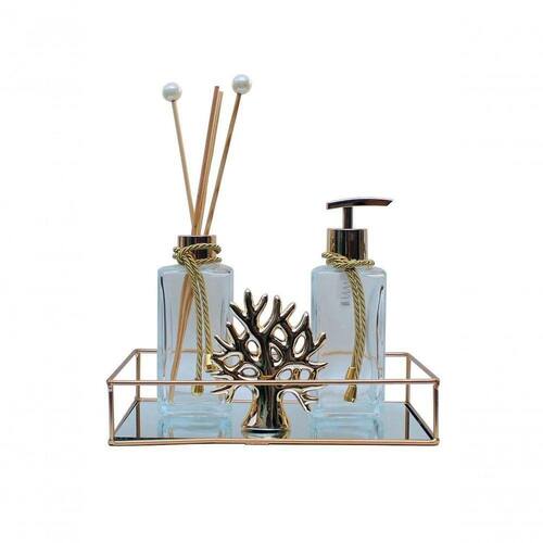 Kit Porta Sabonete e Difusor Transparente com 250ML + Bandeja Dourada + Mini Arvore da Vida