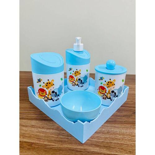 Kit Organizador para bebê c/bandeja em MDF Cor do Pote: BRANCO PADRÃO Tampas: AZUL MATERIAL DOS POTES: ACRÍLICO MATERIAL DA BANDEJA: MDF Kit acompanha: - 1 bandeja de madeira em MDF em formato de Nuvem. - 1 porta sabonete / álcool gel - 1 molheira - 1 porta algodão - 1 porta cotonete MEDIDAS DA BANDEJA EM MDF: Diâmetro: 19,5x19 cm Altura: 5x8cm MEDIDA DOS POTES: Porta algodão/cotonete: 8x10,5 cm Porta sabonete líquido: 12x21 cm Molheira: 8x5 cm Marca: Doya Kids Ean: 7898901271482