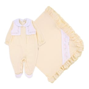 Características do Produto: - Macacão em malha trabalhada, super macia e confortável. Detalhe na parte superior pala em tecido com bordado floral que imita um casaquinho, que dão um charme todo especial a peça. Detalhe de rendinha nos punhos. Gola redonda em tecido com rendado. Punhos com elástico. Abertura nas costas até o meio e entre pernas por pressão. Simplesmente um encanto! - Manta também em malha trabalhada. Detalhes de bordado e plaquinha da marca aplicada. Babadinhos no contorno. Medidas aproximadas da manta: 70cm x 80cm. A Saída Maternidade Meia Estação combina conforto e sofisticação, sendo perfeita para ocasiões especiais, destacando a elegância e o charme da sua pequena princesa.