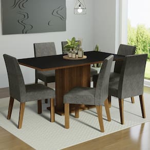 Itens inclusos: - Uma (1) mesa com base pedestal e tampo retangular em MDP - Seis (6) cadeiras estofadas