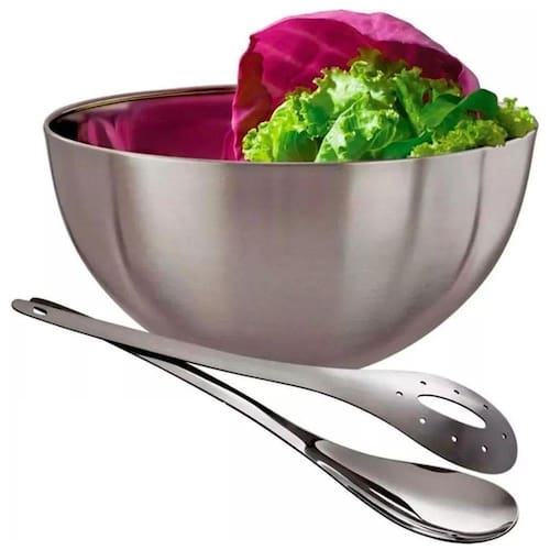 Itens inclusos: - 01 saladeira em aço inox; - 01 pegador com formato de colher; - 01 pegador com formato vazado;