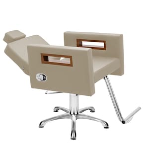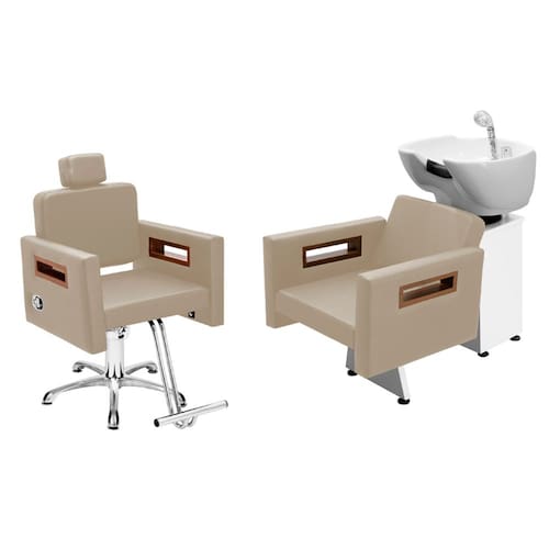- 01 Cadeira Tunísia reclinável, base hidráulica, cabeçote ajustável e removível. - 01 Lavatório Tunísia sem apoio base branca/preta, base de ferro galvanizada, cuba de porcelana móvel, registro cromado com função monocomando, não acompanha aquecedor