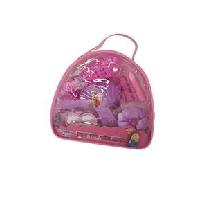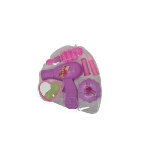 1 bolsa com alça; 1 escovinha de cabelo; 1 batom de brinquedo não possui batom de verdade ; 1 xuxinha de cabelo; 1 Secador de cabelo de brinquedo; 1 anel; 1 espelho em forma de coração