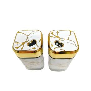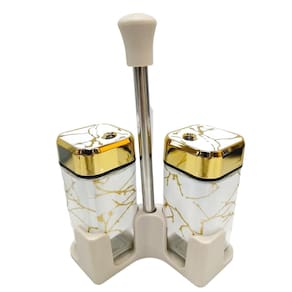 Seja bem-vindo(a) a Loja NIVALMIX, O kit de saleiro e pimenteiro com suporte é a escolha perfeita para quem deseja unir praticidade e elegância à mesa. Com design moderno e detalhes sofisticados em dourado com efeito marmorizado, traz um toque de requinte à decoração da cozinha ou área gourmet.
