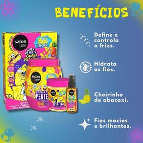 Este conjunto foi formulado para atender às necessidades dos cabelos cacheados infantis, proporcionando hidratação, definição e desembaraço, enquanto garante um cuidado suave e seguro. Com o Kit Salon Line Kids Bob Esponja, os cachinhos dos pequenos ficarão saudáveis, macios e cheios de vida, com um toque de diversão.