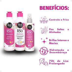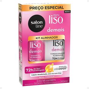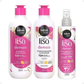 O Kit Salon Line Meu Liso Demais Alinhador é a escolha perfeita para quem deseja cabelos lisos, disciplinados e sem frizz. Composto por Shampoo 300ml, Condicionador 200ml e Spray Defrizante Desembaraçante 200ml, esse kit proporciona um cuidado completo para fios mais alinhados, macios e protegidos. O shampoo limpa suavemente os fios enquanto controla o frizz e prepara o cabelo para um alisamento suave. Sua fórmula eficaz mantém os fios hidratados e disciplinados desde a primeira aplicação. O condicionador hidrata profundamente, selando as cutículas capilares e proporcionando brilho intenso e maciez. O condicionador ajuda a manter o alisamento por mais tempo e deixa os fios mais sedosos e fáceis de desembaraçar. O spray defrizante desembaraçante proporciona proteção térmica contra o calor de secadores e chapinhas, além de ajudar a desembaraçar os fios e controlar o frizz. O spray deixa o cabelo mais alinhado, sem pesar, e garante um efeito liso e duradouro. Este kit foi desenvolvido para cabelos lisos, alisados ou em processo de alisamento, oferecendo cuidados diários que alinham, hidratam e protegem os fios. Com o Kit Meu Liso Demais Alinhador, seus cabelos ficam mais suaves, controlados e com aquele brilho saudável, prontos para encarar o dia com confiança.