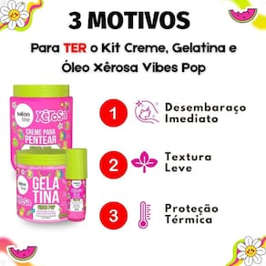Este kit oferece uma rotina de cuidados capilares completa com três produtos essenciais: Creme Para Pentear, Gelatina e Óleo Capilar.