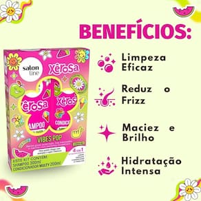 Prepare-se para uma explosão de fragrância e cuidado com o Kit Salon Line Xêrosa Vibes Pop! Este conjunto exclusivo, criado pela SALON LINE, transforma a rotina de cuidados capilares em um momento de puro prazer. Imagine seus cabelos incrivelmente limpos, macios e perfumados, tudo isso com a praticidade que você precisa. Se você busca um toque de alegria e vitalidade para seus fios, este kit é a escolha ideal. Dê adeus aos cabelos sem vida e abrace a experiência Xêrosa Vibes Pop!