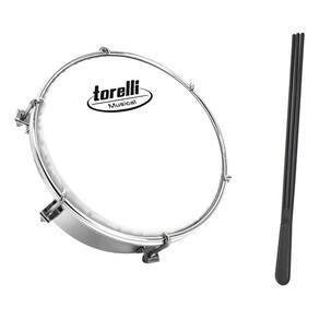 Tamborim - Corpo em aço cromado de 6'' - Altura 5cm - Pele sintética - 6 afinadores - Com baqueta tripla - Fabricante Torelli - Modelo TT414