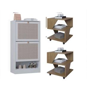 Design contemporaneo e cores modernas Estrutura em BP resistente e duravel Mesas com rodizios para facil movimentacao Sapateira com portas 3D imitando palha indiana Facil de montar produtos enviados desmontados