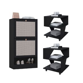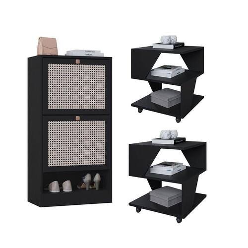 Kit Sapateira 2 Portas E 2 Mesas De Cabeceira/centro Poquema Preto Kit Moveis Spin/Tropical 2 Mesas de Cabeceira e 1 Sapateira 2 Portas Poquema Leve funcionalidade, organizacao e estilo para sua casa com o Kit Tropical da Poquema Moveis, composto por 2 Mesas de Cabeceira e 1 Sapateira. Com design moderno e estrutura em BP (Laminado de Baixa Pressao), os moveis sao resistentes a riscos, umidade e manchas, garantindo durabilidade e facil manutencao.