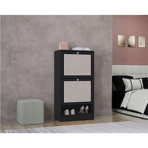 A Sapateira Tropical, com design vertical e portas com pintura 3D que imita palha indiana, oferece um toque sofisticado para o ambiente, sendo perfeita para organizar sapatos em quartos, closets ou lavanderias.