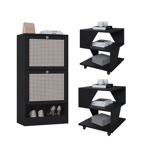 Design contemporaneo e cores modernas Estrutura em BP resistente e duravel Mesas com rodizios para facil movimentacao Sapateira com portas 3D imitando palha indiana Facil de montar produtos enviados desmontados