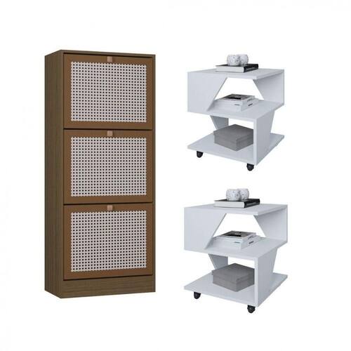 Destaques: Design contemporaneo e cores modernas Estrutura em BP resistente e duravel Mesas com rodizios para facil movimentacao Sapateira com portas 3D imitando palha indiana Facil de montar produtos enviados desmontados