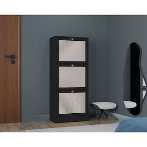 A Sapateira Tropical, com design vertical e portas com pintura 3D que imita palha indiana, oferece um toque sofisticado para o ambiente, sendo perfeita para organizar sapatos em quartos, closets ou lavanderias.