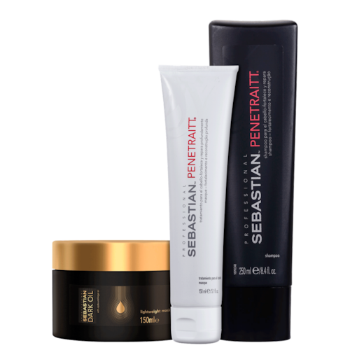 Kit de tratamento para cabelos danificados. Sebastian Professional Dark Oil Penetraitt auxilia na reparação completa dos fios, desde a limpeza até a finalização.