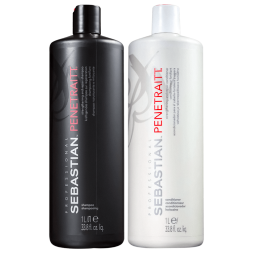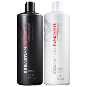 Kit com shampoo e condicionador em tamanho salão para cabelos danificados. Sebastian Professional Penetraitt Duo Salon limpa delicadamente enquanto reconstrói e devolve a força da fibra capilar.