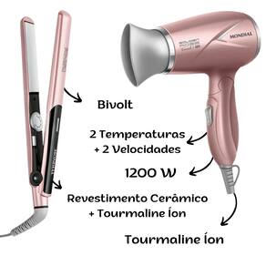 Transforme sua rotina de beleza com este kit sofisticado e funcional da Mondial, reunindo dois aparelhos essenciais para secar, alisar e destacar o brilho dos fios — tudo com estilo e praticidade na elegante cor Golden Rose.