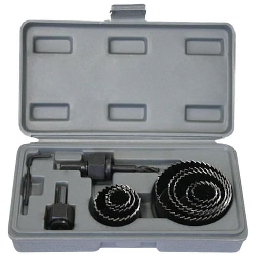 Contém na maleta organizadora: 8 copos de serra: 19 mm, 22 mm, 29 mm, 32 mm, 38 mm, 44 mm, 51 mm, 64 mm. Broca guia e adaptador com hastes de 1/4 e 3/8 e também trava de encaixe das serras. Todos os copos trabalhado em aço carbono.