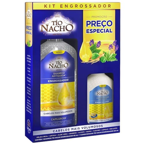 O Kit Shampoo 415ml + Condicionador 200ml Tio Nacho Engrossador é ideal para quem busca cabelos fortes, isso porque possui uma formula com geleia real e ativos que promovem fios grossos, dessa forma o Kit Tio Nacho Engrossador reduz a queda dos fios e promove uma hidratação profunda.