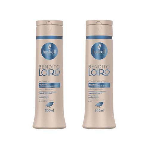 Kit shampoo + condicionador 300ml bendito loiro Descrição Shampoo bendito loiro 300ml O shampoo haskell bendito loiro 300ml é especialmente formulado para atender às necessidades dos cabelos loiros e descoloridos. Enriquecido com extratos naturais, como a camomila e o óleo de girassol, este shampoo ajuda a realçar os reflexos dourados, neutralizar tons amarelados e promover brilho intenso. Sua fórmula suave limpa delicadamente os fios, sem ressecar, proporcionando uma sensação de frescor e leveza. Ideal para quem busca manter a beleza e a vitalidade dos cabelos loiros. Condicionador bendito loiro 300ml O condicionador haskell bendito loiro 300ml é especialmente desenvolvido para cabelos loiros e descoloridos, proporcionando hidratação e proteção aos fios. Enriquecido com extratos naturais, como camomila e óleo de girassol, este condicionador ajuda a intensificar os reflexos dourados, além de suavizar e desembaraçar os cabelos. Sua fórmula leve garante que os fios fiquem macios, brilhantes e saudáveis, evitando o ressecamento e promovendo um aspecto radiante.
