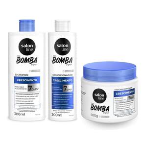 Contém: 01 - Shampoo SOS Bomba Crescimento Capilar, 300ml, Salon Line; 01 - Condicionador SOS Bomba Crescimento Capilar, 200ml, Salon Line; 01 - Máscara SOS Bomba Crescimento Capilar, 500g, Salon Line.