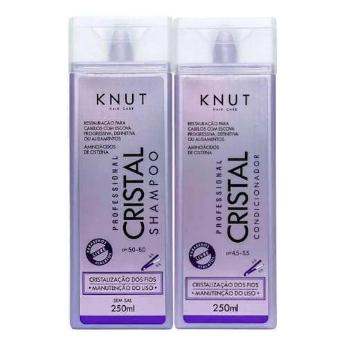 ========================================================================================= Kit Shampoo e Condicionador Pós Química Knut Cristal Kit para cabelos com escova progressiva, definitiva ou alisamento. Kit Knut Cristal Duo mantém o liso e repara os danos. Ele reconstrói a fibra capilar e confere nutrição, para devolver a beleza do cabelo.