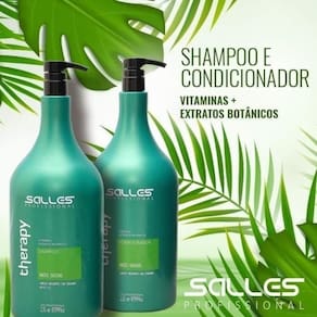 O Shampoo THERAPY Capilar - Salles Foi criado para ser em todos os tipos de cabelo limpa os fios proporcionando-lhes brilho, vitalidade e aparência saudável. Refrescância ao couro cabeludo. Contém: Vitaminas e Extratos Botânicos Passo a Passo: Aplicar o Shampoo THERAPY Capilar Salles sobre os cabelos molhados massageando-os bem. Enxaguar e repetir a operação. Utilizar regularmente com o condicionador THERAPY Capilar Salles para completar a manutenção de tratamento cosmético capilar. Indicação: Para raízes oleosas. Efeito: Cabelos brilhantes e com vitalidade. Condicionador THERAPY Capilar - Salles Possui em sua formula agentes condicionantes que amaciam e desembaraçam os fios com facilidade. Promove brilho e maciez sendo ideal para os enxagues. Logo após finalize como desejar. Contém: Vitaminas e Extratos Botânicos Passo a Passo: Aplicar o Shampoo THERAPY Capilar Salles sobre os cabelos molhados massageando-os bem. Enxaguar e repetir a operação. Utilizar regularmente com o condicionador THERAPY Capilar Salles para completar a manutenção de tratamento cosmético capilar. Indicação: Para raízes oleosas. Efeito: Cabelos brilhantes e com vitalidade. Marca: Não Informado Ean: 7898700162264