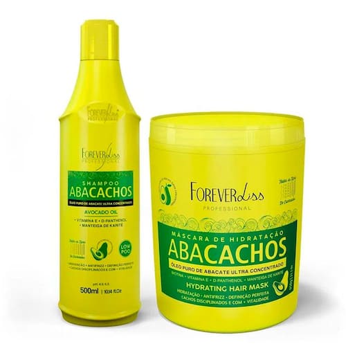 Kit Shampoo e Máscara Capilar Abacachos Forever Liss é perfeito para conquistar os cachos e curvas dos sonhos. Sua formulação possui Óleo puro de Abacate, Vitamina E, D-Pantenol e Manteiga de Karité e foi desenvolvida para deixar os cabelos cacheados, ondulados ou crespos perfeitamente hidratados e nutridos.