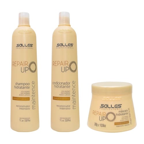 O Kit Repair Up Maintence é um trio completo (Shampoo 1 Litro, Condicionador 1 Litro e Máscara 300 g), desenvolvido para a reconstrução intensiva dos cabelos. Sua fórmula combina ingredientes eficazes que atuam desde o interior da fibra capilar, restaurando a estrutura danificada com força, maciez e brilho profissionais.