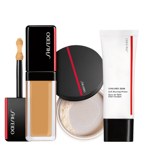 Kit com primer, corretivo líquido e pó solto facial. Shiseido Blurring Self-Refreshing 303 entrega uma aparência com imperfeições minimizadas, mais iluminada e uniforme na maquiagem.
