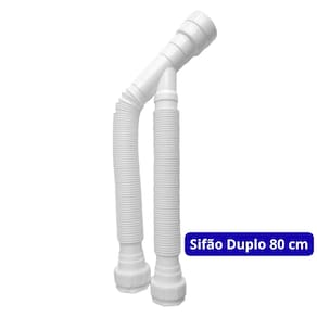 - Sifão duplo: Flexível, comprimento total de 80cm - Material: Plástico resistente, não oxida e suporta umidade constante - Válvula V8: Modelo sem união, cor branca - Compatibilidade: Ideal para cubas ou pias duplas em cozinhas, banheiros e áreas de serviço - Vedação: Sistema seguro contra vazamentos e retorno de odores - Instalação: Rápida, sem necessidade de ferramentas complexas