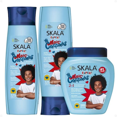 Kit Skala Expert Mais Crespinhos: Shampoo e Condicionador 325ml + Creme de Tratamento 1000g Descubra o cuidado ideal para os cabelos cacheados e crespos dos pequenos com o Kit Skala Expert Mais Crespinhos. Este kit completo, da renomada marca SKALA, oferece uma formulação delicada que limpa sem ressecar, proporcionando nutrição intensa, brilho radiante e um eficaz efeito antifrizz. Seus fios ficarão macios, saudáveis e fáceis de pentear, com uma linha totalmente liberada, livre de sulfatos, parabenos, petrolato e óleo mineral, perfeita para crianças a partir dos 3 anos de idade. A linha Skala Expert Mais Crespinhos foi desenvolvida para facilitar a rotina de cuidados com cabelos crespos e crespíssimos, combinando ativos que nutrem, dão vida aos fios opacos e modelam suavemente.