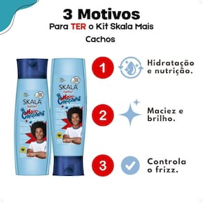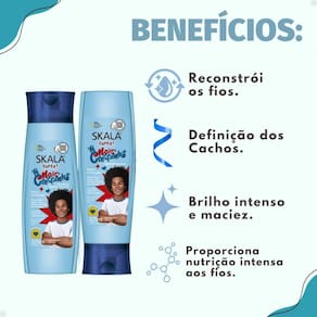 Condicionador: Após lavar os cabelos com o shampoo, aplique o Condicionador Skala Expert Mais Crespinhos nos fios úmidos, do comprimento às pontas. Deixe agir por alguns minutos e enxágue completamente. Para um melhor resultado, utilize a linha completa Skala Expert #MaisCrespinhos Kids.