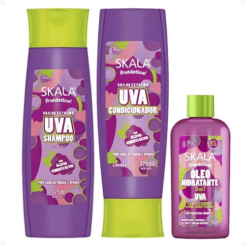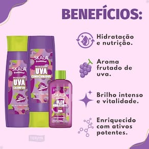 Revitalize seus cabelos com o Kit Skala Frutástica Uva, uma solução completa para hidratação profunda, nutrição e um brilho radiante. Formulado especialmente para cabelos secos e danificados, bem como para fios fracos, opacos e quimicamente tratados, este kit oferece brilho, maciez e força desde a primeira aplicação. Deixe-se envolver pela deliciosa fragrância de Uva e conquiste cabelos mais saudáveis e cheios de vida.