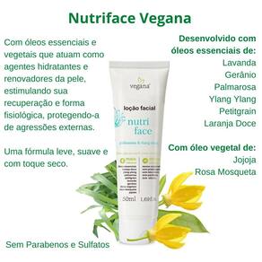 Com ingredientes funcionais, derivados vegetais e de alta compatibilidade com a fisiologia da pele, a Loção Facial vegana Nutriface foi desenvolvida com óleos essenciais de lavanda, gerânio, palmarosa, ylang ylang, petitgrain, laranja doce e vegetais de rosa mosqueta e jojoba que atuam como agentes hidratantes e renovadores da pele, estimulando sua recuperação e forma fisiológica, protegendo-a de agressões externas.