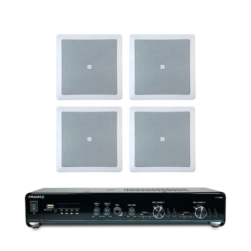 Para a distribuição sonora, o kit inclui quatro caixas acústicas circulares de embutir (6 polegadas). Estas unidades utilizam a tecnologia coaxial (com woofer e tweeter integrados), garantindo que o som seja distribuído de maneira uniforme e coesa. Elas proporcionam uma reprodução sonora clara e balanceada, ideal para música de fundo em salas, escritórios ou varandas cobertas. O conjunto oferece excelente desempenho de áudio com uma instalação limpa e integrada ao teto. Ean: 7896673817914