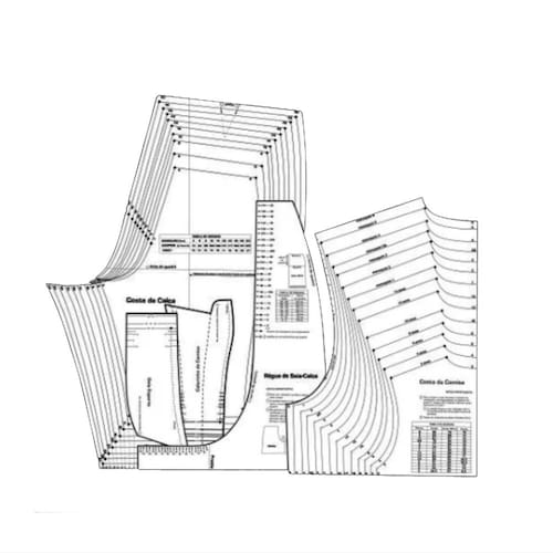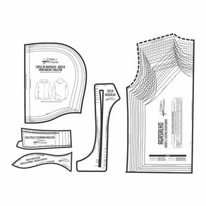Frente de calça Costas da calça Régua de 1/4 para a cinturar Régua saia e calça Manga do blazer superior Manga do blazer inferior Colarinho da camisa Frente camisa Costa camisa Manga da camisa Frente da blusa Costas da blusa Manga da blusa Gola militar Gola esporte Gola italiana